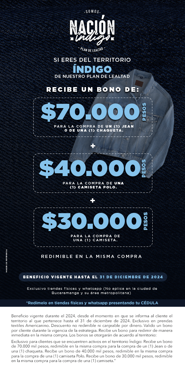Válido del 03 de febrero al 31 de agosto de 2026. Por la compra de una prenda de cualquier referencia diferente a las referencias de la categoría "JEAN", recibe un bono de $100.000 pesos para redimir en jeans de la marca Americanino para una futura compra. Aplica exclusivamente en la tienda online americanino.com. La redención del bono aplica entre el 03 de febrero al 31 de agosto de 2026 en la tienda online americanino.com, ingresando la palabra clave enviada al correo en el carrito de compras antes de finalizar el pago. Beneficio personal e intransferible, otorgado exclusivamente a los clientes que reciban la comunicación del beneficio por correo electrónico o SMS. Válido un (1) bono por cliente durante toda la vigencia de la estrategia. El bono solo podrá ser redimido en jeans de la marca Americanino. No es acumulable con otras promociones, campañas y/o descuentos vigentes. No es redimible ni canjeable por dinero en efectivo. No aplica para la compra de bonos regalo, calzado, accesorios, gorras ni productos de marcas aliadas. En caso de cambio o garantía, se reconocerá únicamente el valor efectivamente pagado por la(s) prenda(s), conforme a la política de cambios y garantías vigente.