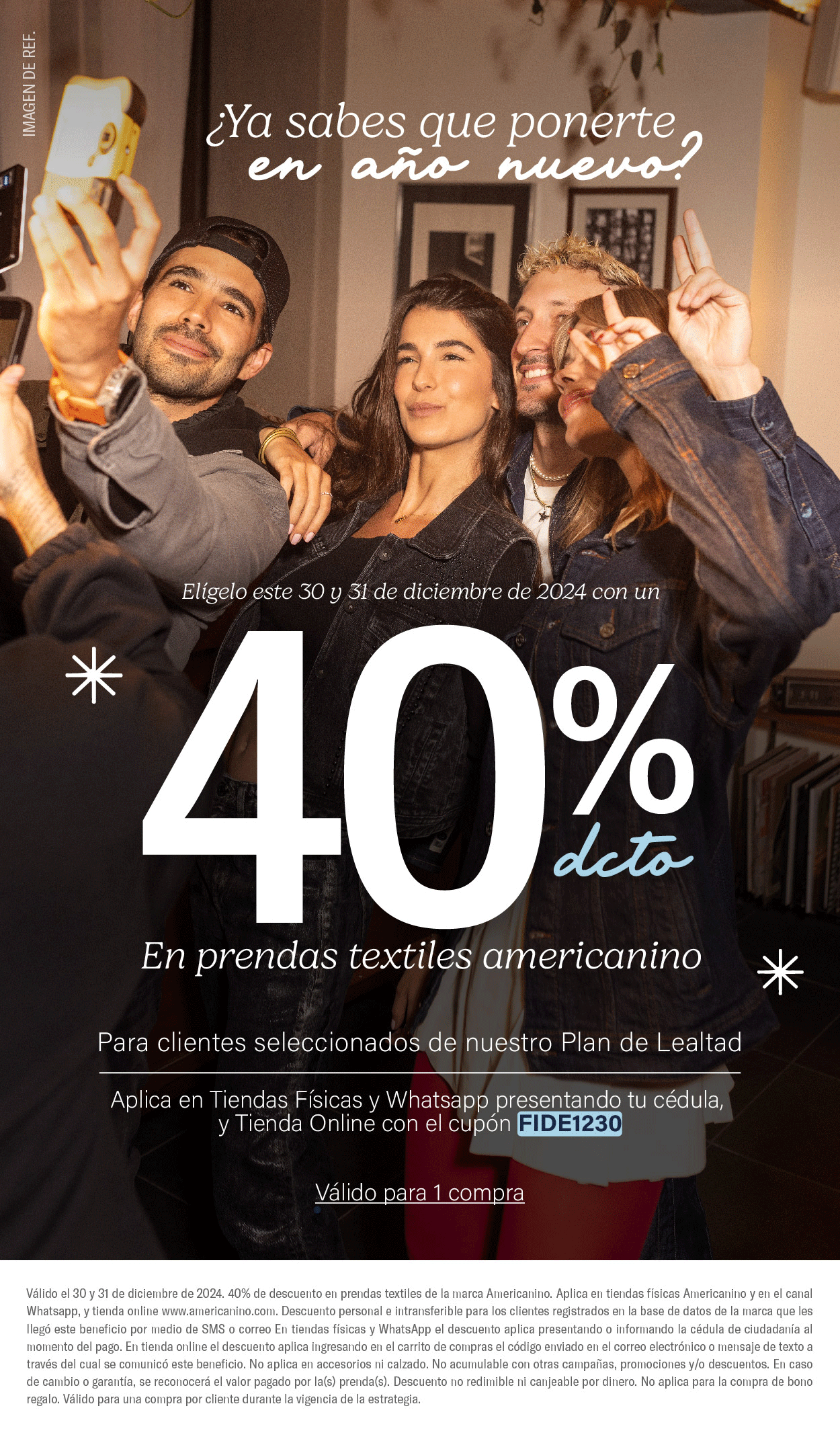 Válido del 1 al 30 de abril del 2026. 40% de descuento en prendas textiles de la marca Americanino. Aplica exclusivamente en la tienda online www.americanino.com.co. El beneficio aplica únicamente para clientes impactados por pauta digital y se redime ingresando el código al momento del pago. El descuento no aplica en tiendas físicas ni en el canal WhatsApp. No aplica en accesorios, gorras ni calzado. No aplica en productos de marcas aliadas. No acumulable con otras campañas, promociones y/o descuentos vigentes. En caso de cambio y/o garantía, se reconocerá el valor efectivamente pagado por la(s) prenda(s).El descuento no es redimible ni canjeable por dinero, ni aplica para la compra de bono regalo.