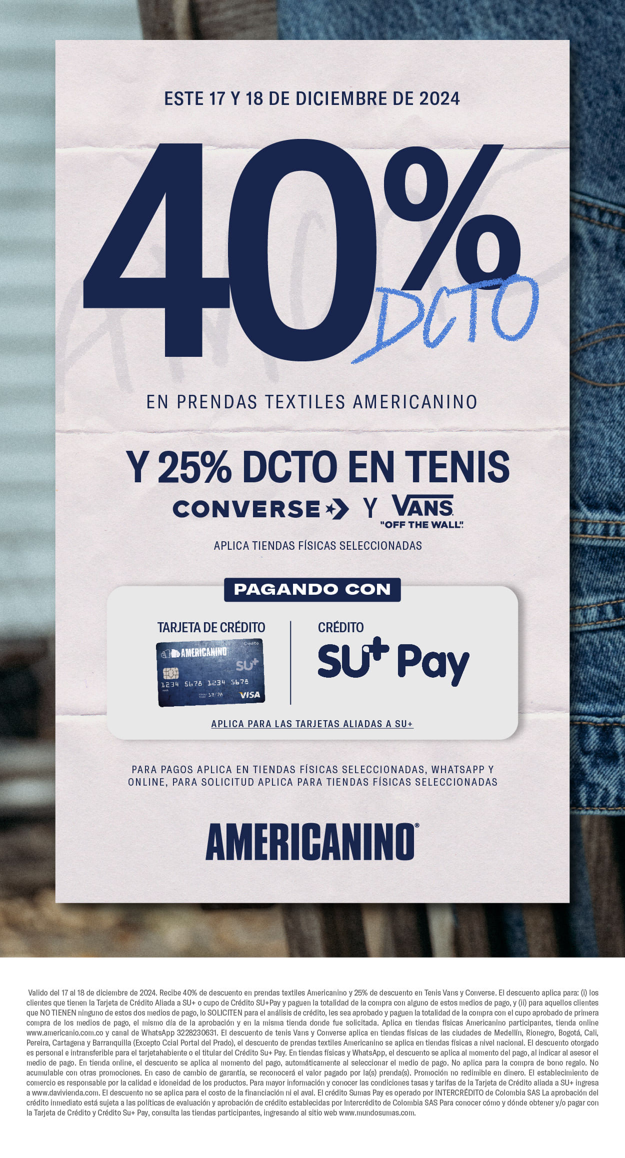Valido del 19 al 31 de marzo de 2025. 40% de descuento en prendas Americanino aplica para: (i) los clientes que previamente a la vigencia de la promoción tengan la Tarjeta de Crédito Americanino aliada a SUMAS o cupo de Crédito SUMAS y paguen la totalidad de la compra con alguno de estos medios de pago. Aplica en tiendas físicas Americanino participantes, tienda online www.americanino.com.co y canal de WhatsApp 3228230631. Descuento personal e intransferible para el tarjetahabiente o el titular del Crédito SUMAS a quienes les llegó este beneficio por medio de SMS, correo electrónico o WhatsApp. Aplica para una sola compra. Para conocer cómo y dónde obtener y/o pagar con la Tarjeta de Crédito y Crédito SUMAS, consulta las tiendas participantes, ingresando al sitio web www.mundosumas.com. En tiendas físicas y WhatsApp, el descuento aplica al momento del pago, al indicar al asesor el medio de pago y presentar la cédula de ciudadanía. En tienda online, el descuento aplica al momento del pago, automáticamente al seleccionar el medio de pago e informar la cédula de ciudadanía. No aplica para la compra de bono regalo. No acumulable con otras promociones. En caso de cambio o garantía, se reconocerá el valor pagado por la(s) prenda(s). Promoción no redimible en dinero. El establecimiento de comercio es responsable por la calidad e idoneidad de los productos. Para mayor información y conocer las condiciones tasas y tarifas de la Tarjeta de Crédito aliada a SUMAS ingresa a www.davivienda.com. La aprobación del crédito inmediato está sujeta a las políticas de evaluación y aprobación de crédito establecidas por Intercrédito de Colombia S.A.S. El descuento no aplica para el costo de la financiación ni el seguro. El crédito SUMAS es operado por Intercredito de Colombia S.A.S.