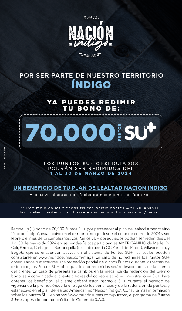 Válido del 03 de febrero al 31 de agosto de 2026. Por la compra de una prenda de cualquier referencia diferente a las referencias de la categoría "JEAN", recibe un bono de $100.000 pesos para redimir en jeans de la marca Americanino para una futura compra. Aplica exclusivamente en la tienda online americanino.com. La redención del bono aplica entre el 03 de febrero al 31 de agosto de 2026 en la tienda online americanino.com, ingresando la palabra clave enviada al correo en el carrito de compras antes de finalizar el pago. Beneficio personal e intransferible, otorgado exclusivamente a los clientes que reciban la comunicación del beneficio por correo electrónico o SMS. Válido un (1) bono por cliente durante toda la vigencia de la estrategia. El bono solo podrá ser redimido en jeans de la marca Americanino. No es acumulable con otras promociones, campañas y/o descuentos vigentes. No es redimible ni canjeable por dinero en efectivo. No aplica para la compra de bonos regalo, calzado, accesorios, gorras ni productos de marcas aliadas. En caso de cambio o garantía, se reconocerá únicamente el valor efectivamente pagado por la(s) prenda(s), conforme a la política de cambios y garantías vigente.
