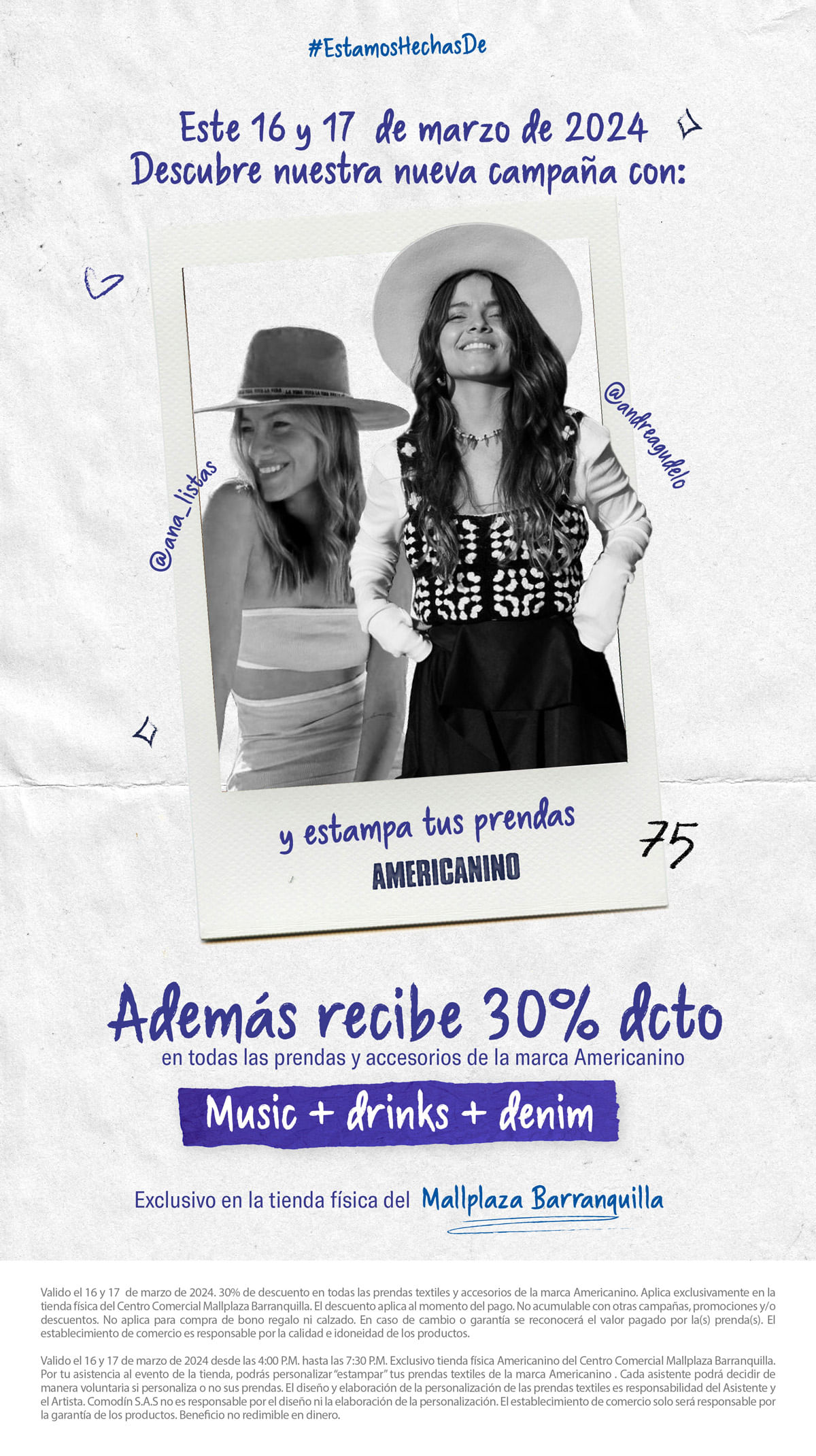Válido del 4 al 31 de marzo del 2026. 40% de descuento en prendas textiles de la marca Americanino. Aplica exclusivamente en la tienda online www.americanino.com.co. El beneficio aplica únicamente para clientes impactados por pauta digital y se redime ingresando el código AME40 al momento del pago. El descuento no aplica en tiendas físicas ni en el canal WhatsApp. No aplica en accesorios, gorras ni calzado. No aplica en productos de marcas aliadas. No acumulable con otras campañas, promociones y/o descuentos vigentes. En caso de cambio y/o garantía, se reconocerá el valor efectivamente pagado por la(s) prenda(s).El descuento no es redimible ni canjeable por dinero, ni aplica para la compra de bono regalo.