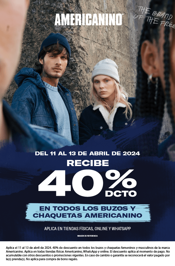 Válido del 4 al 31 de marzo del 2026. 40% de descuento en prendas textiles de la marca Americanino. Aplica exclusivamente en la tienda online www.americanino.com.co. El beneficio aplica únicamente para clientes impactados por pauta digital y se redime ingresando el código AME40 al momento del pago. El descuento no aplica en tiendas físicas ni en el canal WhatsApp. No aplica en accesorios, gorras ni calzado. No aplica en productos de marcas aliadas. No acumulable con otras campañas, promociones y/o descuentos vigentes. En caso de cambio y/o garantía, se reconocerá el valor efectivamente pagado por la(s) prenda(s).El descuento no es redimible ni canjeable por dinero, ni aplica para la compra de bono regalo.