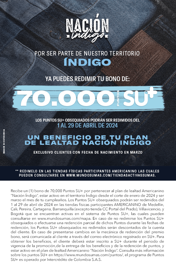 Válido del 03 de febrero al 31 de agosto de 2026. Por la compra de una prenda de cualquier referencia diferente a las referencias de la categoría "JEAN", recibe un bono de $100.000 pesos para redimir en jeans de la marca Americanino para una futura compra. Aplica exclusivamente en la tienda online americanino.com. La redención del bono aplica entre el 03 de febrero al 31 de agosto de 2026 en la tienda online americanino.com, ingresando la palabra clave enviada al correo en el carrito de compras antes de finalizar el pago. Beneficio personal e intransferible, otorgado exclusivamente a los clientes que reciban la comunicación del beneficio por correo electrónico o SMS. Válido un (1) bono por cliente durante toda la vigencia de la estrategia. El bono solo podrá ser redimido en jeans de la marca Americanino. No es acumulable con otras promociones, campañas y/o descuentos vigentes. No es redimible ni canjeable por dinero en efectivo. No aplica para la compra de bonos regalo, calzado, accesorios, gorras ni productos de marcas aliadas. En caso de cambio o garantía, se reconocerá únicamente el valor efectivamente pagado por la(s) prenda(s), conforme a la política de cambios y garantías vigente.