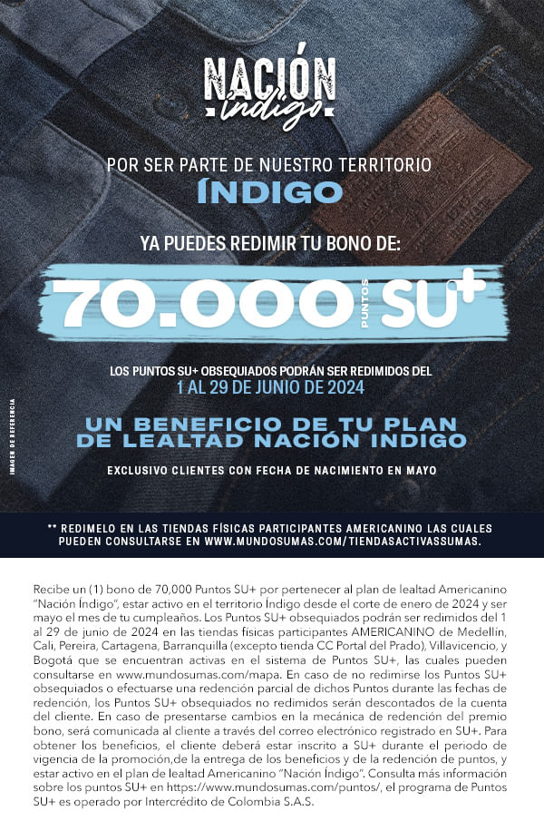 Válido del 03 de febrero al 31 de agosto de 2026. Por la compra de una prenda de cualquier referencia diferente a las referencias de la categoría "JEAN", recibe un bono de $100.000 pesos para redimir en jeans de la marca Americanino para una futura compra. Aplica exclusivamente en la tienda online americanino.com. La redención del bono aplica entre el 03 de febrero al 31 de agosto de 2026 en la tienda online americanino.com, ingresando la palabra clave enviada al correo en el carrito de compras antes de finalizar el pago. Beneficio personal e intransferible, otorgado exclusivamente a los clientes que reciban la comunicación del beneficio por correo electrónico o SMS. Válido un (1) bono por cliente durante toda la vigencia de la estrategia. El bono solo podrá ser redimido en jeans de la marca Americanino. No es acumulable con otras promociones, campañas y/o descuentos vigentes. No es redimible ni canjeable por dinero en efectivo. No aplica para la compra de bonos regalo, calzado, accesorios, gorras ni productos de marcas aliadas. En caso de cambio o garantía, se reconocerá únicamente el valor efectivamente pagado por la(s) prenda(s), conforme a la política de cambios y garantías vigente.