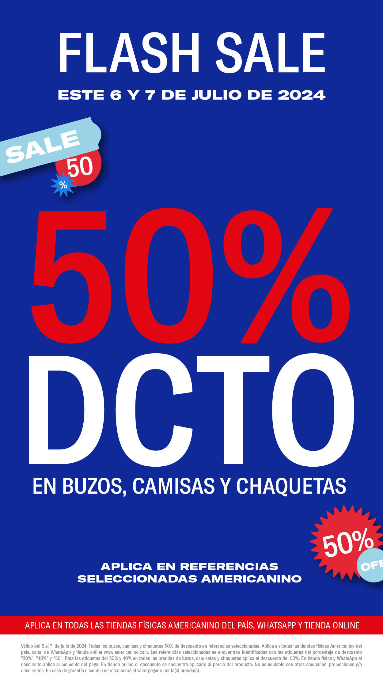 Válido del 28 de Marzo de 2026 al 3 de Abril del 2026. 50% de descuento en referencias seleccionadas. Exclusivo en la tienda online www.americanino.com. Las referencias seleccionadas son las referencias de la sección “SALE” que se encuentran identificadas con la etiqueta de descuento “50%”. El respectivo descuento se encuentra aplicado en el precio especial de cada prenda. No aplica en tiendas físicas ni canal de WhatsApp. No acumulable con otras promociones y/o descuentos. En caso de cambio o garantía, se reconocerá el valor pagado por la prenda. Este beneficio no es redimible en dinero.