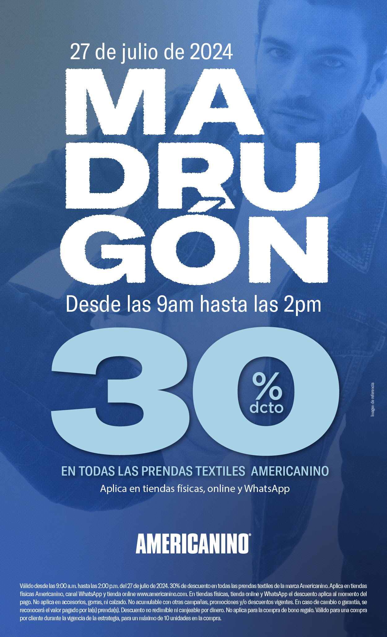 Válido del 20 de marzo al 22 de marzo de 2026. 40% de descuento en todas las prendas textiles de la marca Americanino. Aplica en tiendas físicas Americanino, tienda online www.americanino.com y en el canal WhatsApp Americanino. Descuento personal e intransferible para los clientes previamente registrados en la base de datos de la marca a quienes les llegó este beneficio por medio de SMS o correo electrónico. El descuento