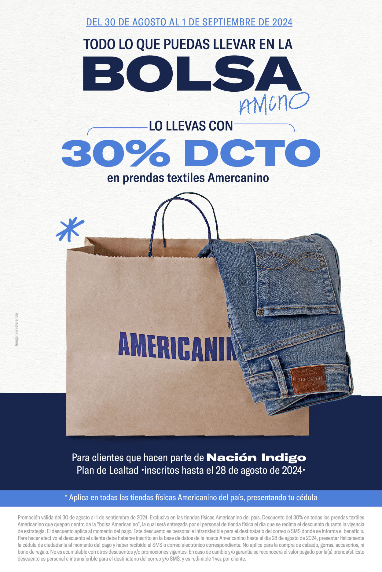 Válido del 03 de febrero al 31 de agosto de 2026. Por la compra de una prenda de cualquier referencia diferente a las referencias de la categoría "JEAN", recibe un bono de $100.000 pesos para redimir en jeans de la marca Americanino para una futura compra. Aplica exclusivamente en la tienda online americanino.com. La redención del bono aplica entre el 03 de febrero al 31 de agosto de 2026 en la tienda online americanino.com, ingresando la palabra clave enviada al correo en el carrito de compras antes de finalizar el pago. Beneficio personal e intransferible, otorgado exclusivamente a los clientes que reciban la comunicación del beneficio por correo electrónico o SMS. Válido un (1) bono por cliente durante toda la vigencia de la estrategia. El bono solo podrá ser redimido en jeans de la marca Americanino. No es acumulable con otras promociones, campañas y/o descuentos vigentes. No es redimible ni canjeable por dinero en efectivo. No aplica para la compra de bonos regalo, calzado, accesorios, gorras ni productos de marcas aliadas. En caso de cambio o garantía, se reconocerá únicamente el valor efectivamente pagado por la(s) prenda(s), conforme a la política de cambios y garantías vigente.