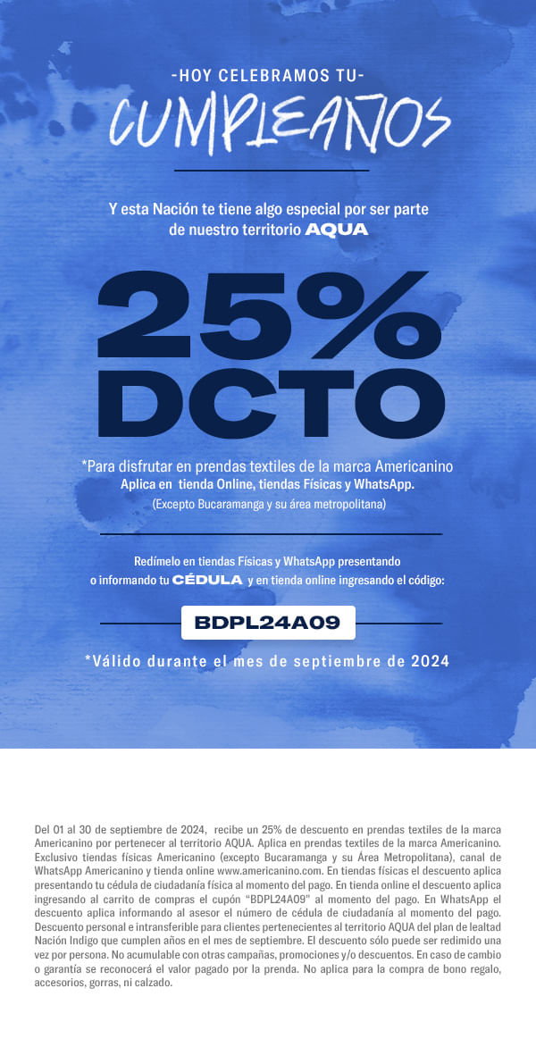 Válido del 04 de febrero al 30 de abril de 2026. 40% de descuento en prendas textiles de la marca Americanino. Aplica exclusivamente en la tienda online www.americanino.com.co. El beneficio aplica únicamente para clientes impactados por pauta digital y se redime ingresando el código AMCNO40 al momento del pago. El descuento no aplica en tiendas físicas ni en el canal WhatsApp. No aplica en accesorios, gorras ni calzado. No aplica en productos de marcas aliadas. No acumulable con otras campañas, promociones y/o descuentos vigentes. En caso de cambio y/o garantía, se reconocerá el valor efectivamente pagado por la(s) prenda(s).El descuento no es redimible ni canjeable por dinero, ni aplica para la compra de bono regalo.