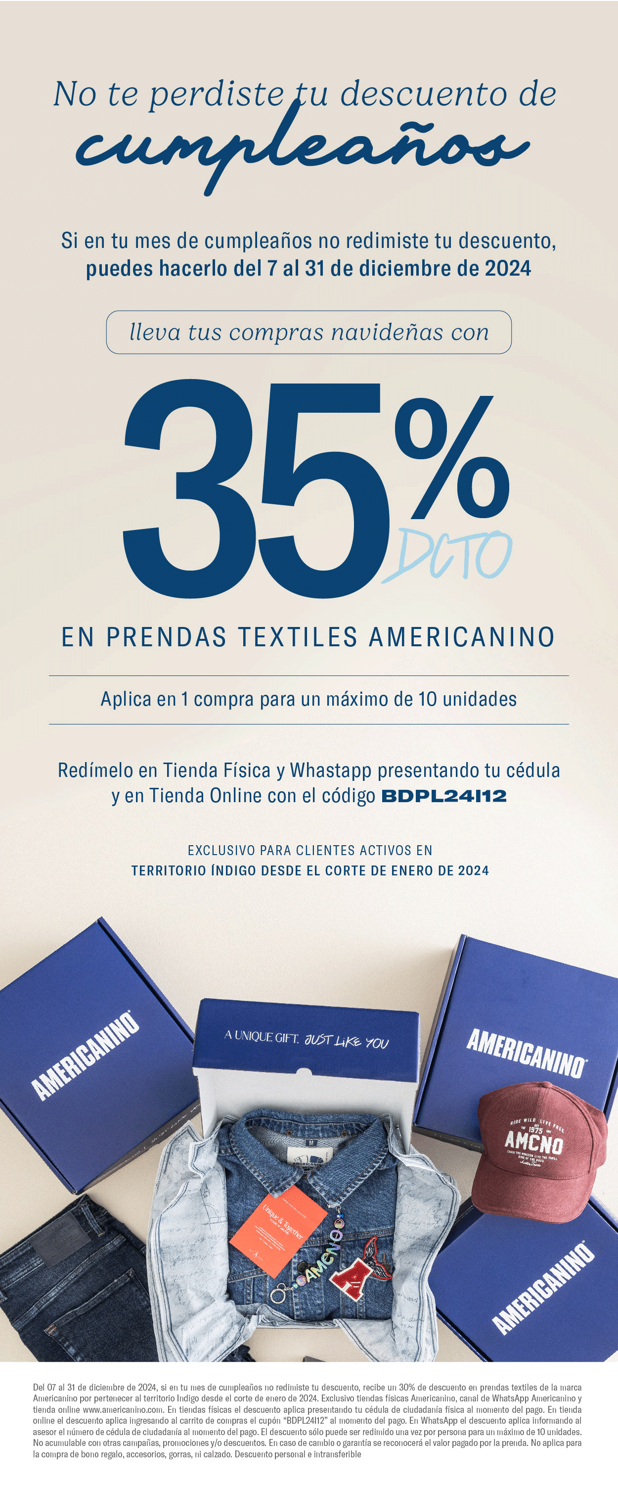 Valido del 27 de marzo al 31 de julio de 2026. 10% de descuento en prendas textiles de la marca Americanino. Aplica exclusivamente en la tienda online www.americanino.com.co. El beneficio aplica únicamente para clientes impactados por pauta digital, eMail, SMS o WhatsApp y se redime ingresando el código al momento del pago. El descuento no aplica en tiendas físicas ni en el canal WhatsApp. El descuento es acumulable con otras campañas, promociones y/o descuentos vigentes y se aplicará de forma adicional a los descuentos iniciales que tenga el producto al momento del pago. En caso de cambio y/o garantía, se reconocerá el valor efectivamente pagado por la(s) prenda(s). El descuento no es redimible ni canjeable por dinero, ni aplica para la compra de bono regalo.