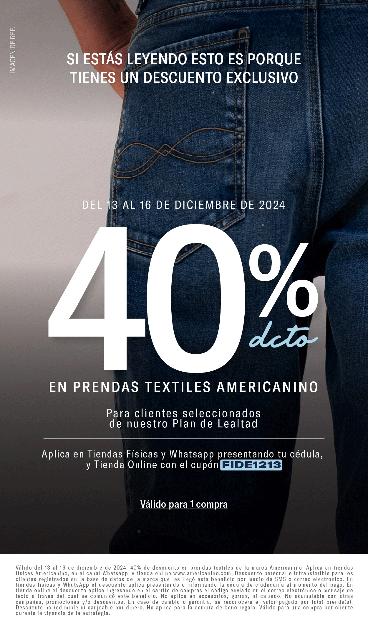 Válido del 04 de febrero al 30 de abril de 2026. 40% de descuento en prendas textiles de la marca Americanino. Aplica exclusivamente en la tienda online www.americanino.com.co. El beneficio aplica únicamente para clientes impactados por pauta digital y se redime ingresando el código AMCNO40 al momento del pago. El descuento no aplica en tiendas físicas ni en el canal WhatsApp. No aplica en accesorios, gorras ni calzado. No aplica en productos de marcas aliadas. No acumulable con otras campañas, promociones y/o descuentos vigentes. En caso de cambio y/o garantía, se reconocerá el valor efectivamente pagado por la(s) prenda(s).El descuento no es redimible ni canjeable por dinero, ni aplica para la compra de bono regalo.