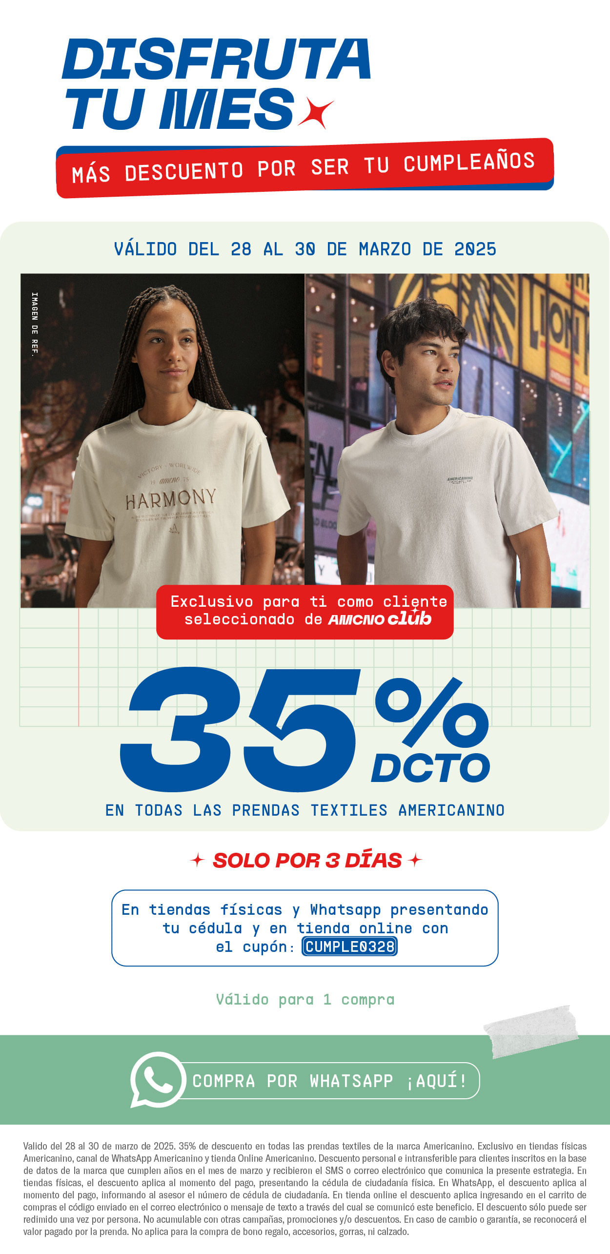 Válido del 10 al 30 de abril de 2026. Recibe 35% de descuento en prendas textiles Americanino para clientes con tres (3) o más compras realizadas entre enero y marzo de 2026. Aplica en tiendas físicas Americanino, tienda online https://www.americanino.com y en el canal WhatsApp Americanino. El descuento aplica en tiendas físicas o Whatsapp al momento del pago, presentando o informando la cédula de ciudadanía y en sitio web al momento del pago ingresando el código. No aplica en accesorios, gorras, calzado, productos de marcas aliadas ni en la compra de bono regalo. No acumulable con otras promociones y/o descuentos vigentes. El descuento se aplica al momento del pago ingresando el código de la promoción. El descuento sólo puede ser redimido una vez por persona. En caso de cambio y/o garantía, se reconocerá el valor efectivamente pagado. Beneficio personal e intransferible. No redimible por dinero.