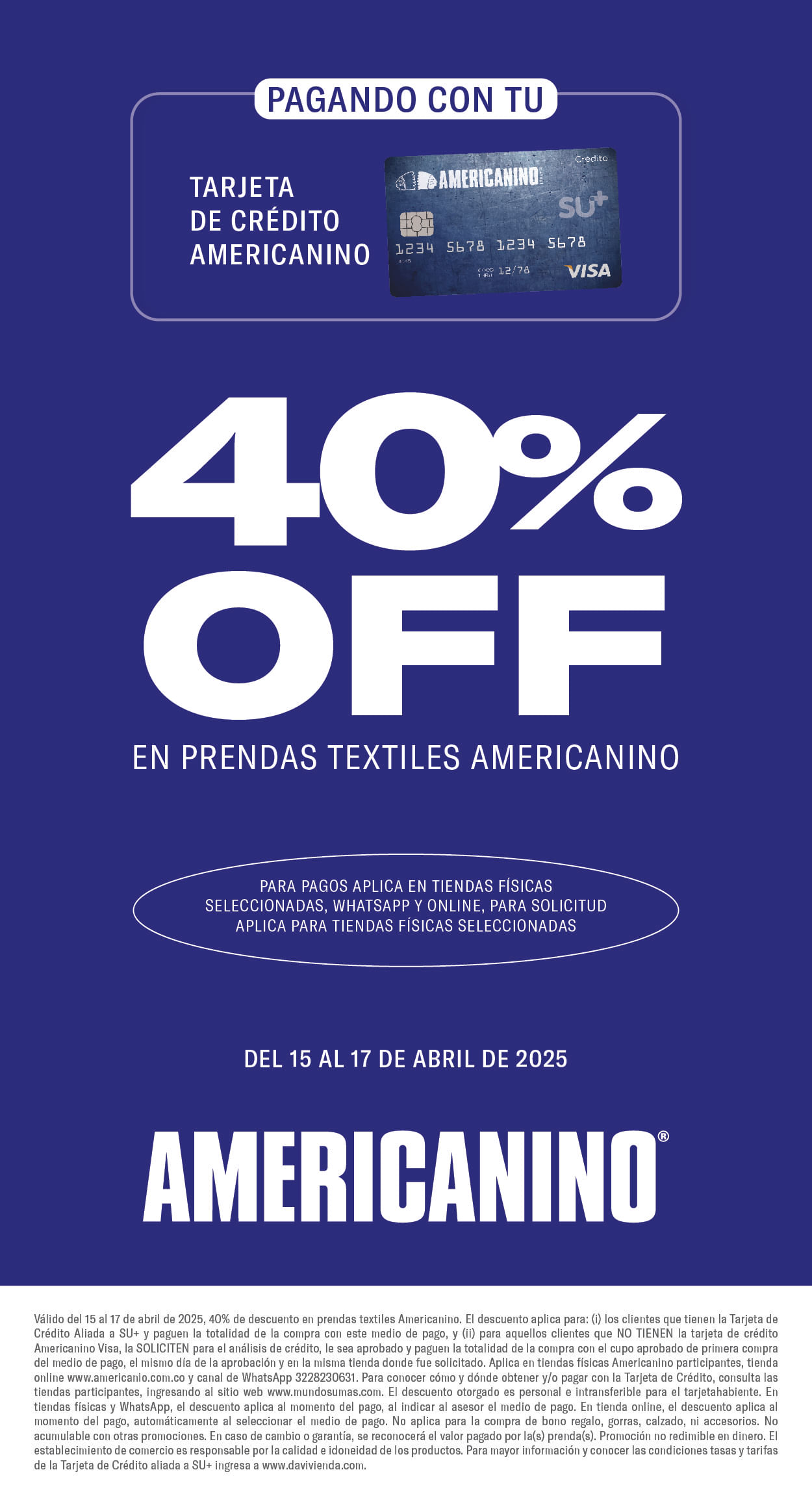 Valido del 19 al 31 de marzo de 2025. 40% de descuento en prendas Americanino aplica para: (i) los clientes que previamente a la vigencia de la promoción tengan la Tarjeta de Crédito Americanino aliada a SUMAS o cupo de Crédito SUMAS y paguen la totalidad de la compra con alguno de estos medios de pago. Aplica en tiendas físicas Americanino participantes, tienda online www.americanino.com.co y canal de WhatsApp 3228230631. Descuento personal e intransferible para el tarjetahabiente o el titular del Crédito SUMAS a quienes les llegó este beneficio por medio de SMS, correo electrónico o WhatsApp. Aplica para una sola compra. Para conocer cómo y dónde obtener y/o pagar con la Tarjeta de Crédito y Crédito SUMAS, consulta las tiendas participantes, ingresando al sitio web www.mundosumas.com. En tiendas físicas y WhatsApp, el descuento aplica al momento del pago, al indicar al asesor el medio de pago y presentar la cédula de ciudadanía. En tienda online, el descuento aplica al momento del pago, automáticamente al seleccionar el medio de pago e informar la cédula de ciudadanía. No aplica para la compra de bono regalo. No acumulable con otras promociones. En caso de cambio o garantía, se reconocerá el valor pagado por la(s) prenda(s). Promoción no redimible en dinero. El establecimiento de comercio es responsable por la calidad e idoneidad de los productos. Para mayor información y conocer las condiciones tasas y tarifas de la Tarjeta de Crédito aliada a SUMAS ingresa a www.davivienda.com. La aprobación del crédito inmediato está sujeta a las políticas de evaluación y aprobación de crédito establecidas por Intercrédito de Colombia S.A.S. El descuento no aplica para el costo de la financiación ni el seguro. El crédito SUMAS es operado por Intercredito de Colombia S.A.S.