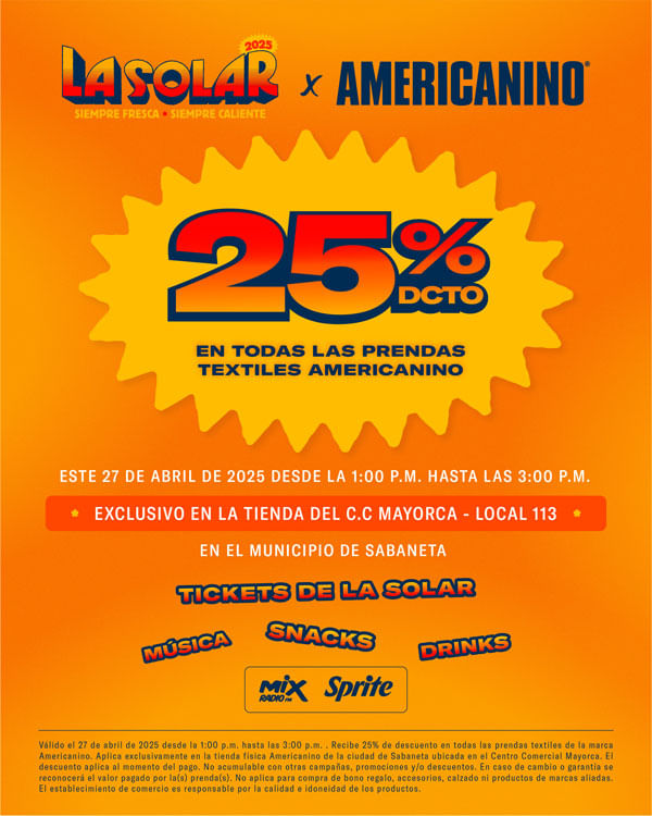 Válido del 2 al 6 de abril del 2026. 35% de descuento en prendas textiles de la marca Americanino. Aplica exclusivamente en la tienda online www.americanino.com.co. El beneficio aplica únicamente para clientes impactados por la comunicación en el sitio web y se redime ingresando el código AME35 al momento del pago. El descuento no aplica en tiendas físicas ni en el canal WhatsApp. No aplica en accesorios, gorras ni calzado. No aplica en productos de marcas aliadas. No acumulable con otras campañas, promociones y/o descuentos vigentes. En caso de cambio y/o garantía, se reconocerá el valor efectivamente pagado por la(s) prenda(s).El descuento no es redimible ni canjeable por dinero, ni aplica para la compra de bono regalo.