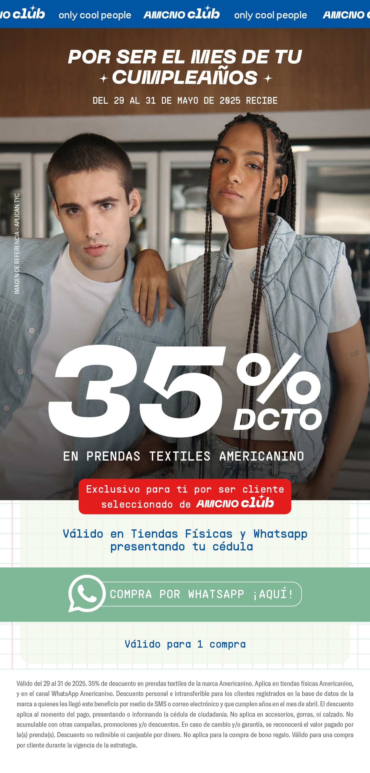 Válido del 10 al 30 de abril de 2026. Recibe 35% de descuento en prendas textiles Americanino para clientes con tres (3) o más compras realizadas entre enero y marzo de 2026. Aplica en tiendas físicas Americanino, tienda online https://www.americanino.com y en el canal WhatsApp Americanino. El descuento aplica en tiendas físicas o Whatsapp al momento del pago, presentando o informando la cédula de ciudadanía y en sitio web al momento del pago ingresando el código. No aplica en accesorios, gorras, calzado, productos de marcas aliadas ni en la compra de bono regalo. No acumulable con otras promociones y/o descuentos vigentes. El descuento se aplica al momento del pago ingresando el código de la promoción. El descuento sólo puede ser redimido una vez por persona. En caso de cambio y/o garantía, se reconocerá el valor efectivamente pagado. Beneficio personal e intransferible. No redimible por dinero.