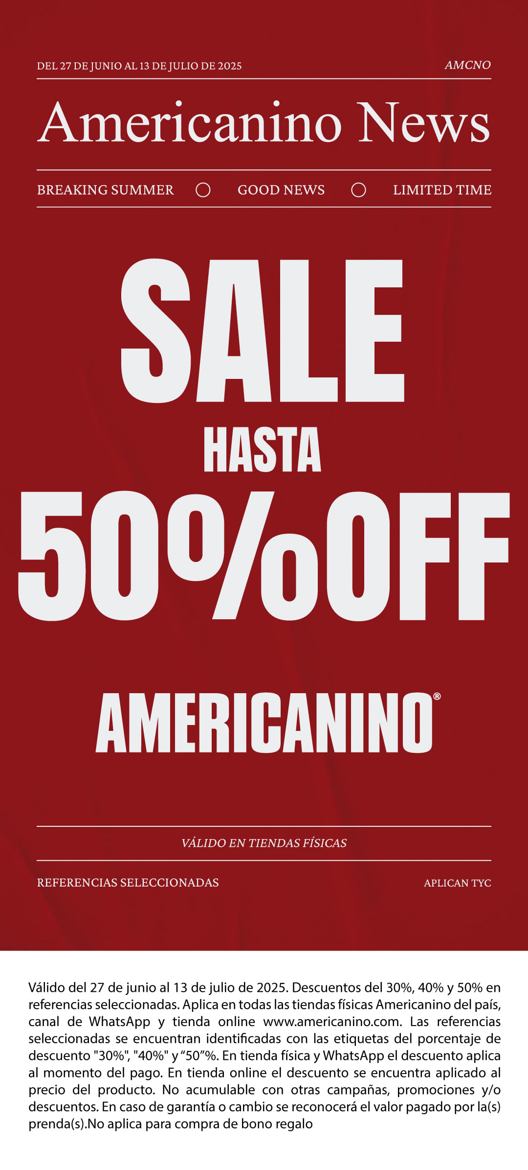 Válido el 14 de abril de 2026. Desde el 30% hasta el 50% de descuento en referencias seleccionadas. Exclusivo en tienda online www.americanino.com. Las referencias seleccionadas se encuentran identificadas con la etiqueta que indica el respectivo descuento. El descuento se encuentra aplicado en el precio especial de cada prenda. No aplica en Tiendas Físicas ni canal de WhatsApp. No acumulable con otras promociones y/o descuentos. En caso de cambio o garantía, se reconocerá el valor pagado por la(s) prenda(s). No aplica para la compra de bono regalo. Promoción no redimible en dinero.
