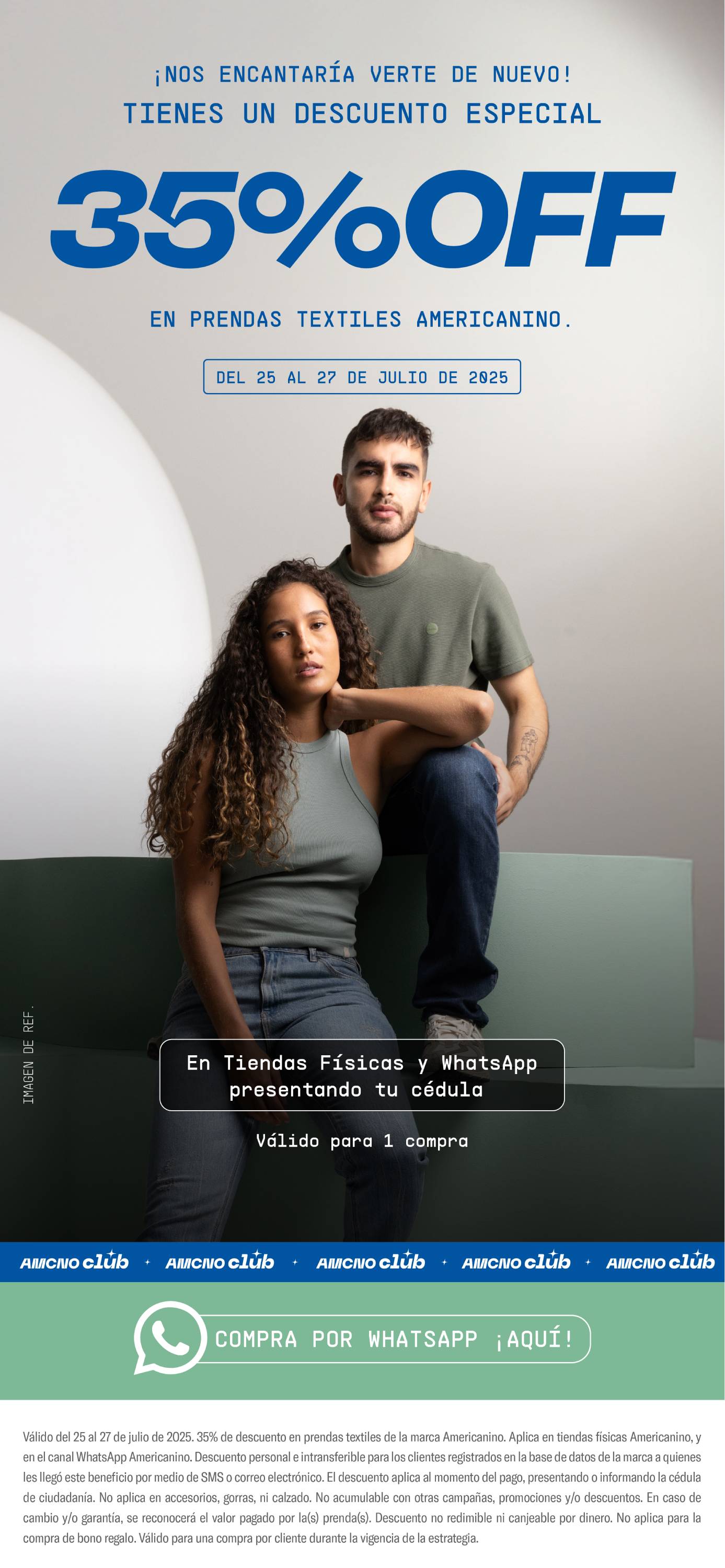 Válido del 10 al 30 de abril de 2026. Recibe 35% de descuento en prendas textiles Americanino para clientes con tres (3) o más compras realizadas entre enero y marzo de 2026. Aplica en tiendas físicas Americanino, tienda online https://www.americanino.com y en el canal WhatsApp Americanino. El descuento aplica en tiendas físicas o Whatsapp al momento del pago, presentando o informando la cédula de ciudadanía y en sitio web al momento del pago ingresando el código. No aplica en accesorios, gorras, calzado, productos de marcas aliadas ni en la compra de bono regalo. No acumulable con otras promociones y/o descuentos vigentes. El descuento se aplica al momento del pago ingresando el código de la promoción. El descuento sólo puede ser redimido una vez por persona. En caso de cambio y/o garantía, se reconocerá el valor efectivamente pagado. Beneficio personal e intransferible. No redimible por dinero.