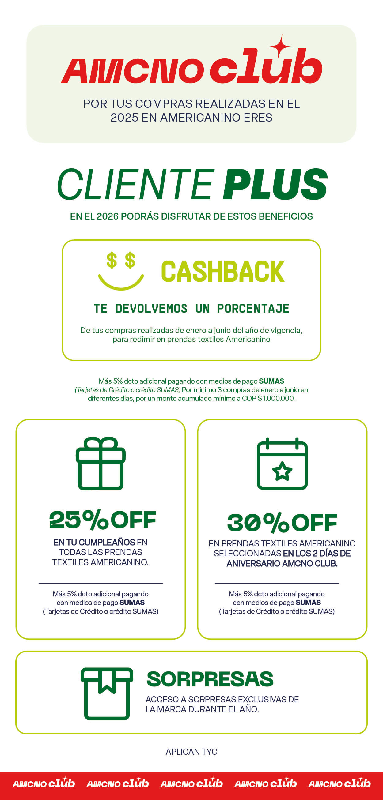 Válido del 6 de marzo al 31 de mayo de 2026. 15% de descuento en prendas textiles de la marca Americanino. Aplica exclusivamente en la tienda online www.americanino.com.co. El beneficio aplica únicamente para la primera compra de los usuarios que se suscriban a la base de datos de Americanino a través de los formularios de registro de americanino.com. El descuento aplica al momento del pago, y se redime ingresando el código de descuento otorgado por la marca una vez se culmine el registro (código de descuento AMCNOCLUB15). El descuento no aplica en tiendas físicas ni en el canal WhatsApp. El descuento es acumulable con otras campañas, promociones y/o descuentos vigentes y se aplicará de forma adicional a los descuentos iniciales que tenga el producto al momento del pago. En caso de cambio y/o garantía, se reconocerá el valor efectivamente pagado por la(s) prenda(s). El descuento no es redimible ni canjeable por dinero. El descuento no aplica para la compra de bono regalo, accesorios, calzado, ni productos de marcas aliadas.