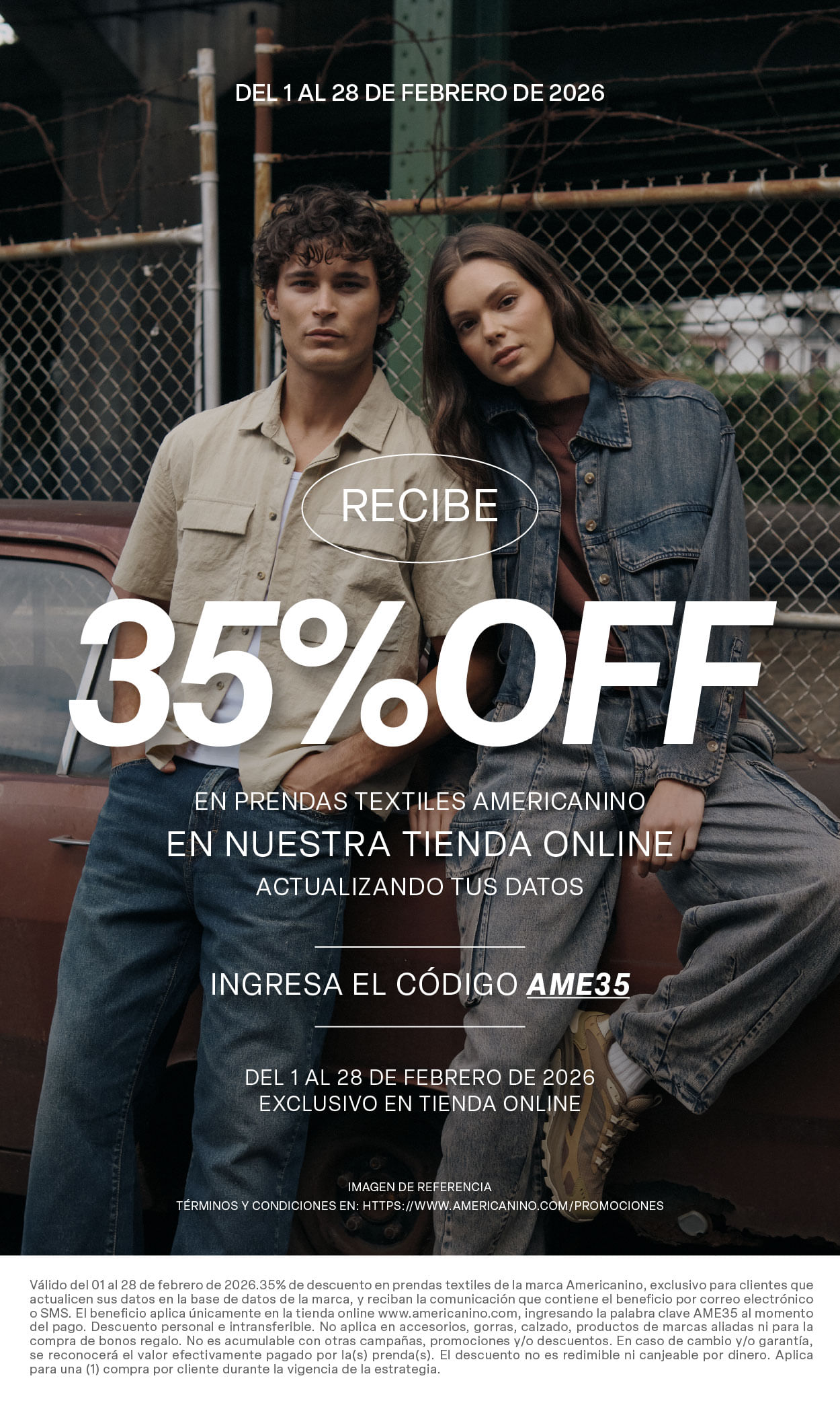 Válido del 10 al 30 de abril de 2026. Recibe 35% de descuento en prendas textiles Americanino para clientes con tres (3) o más compras realizadas entre enero y marzo de 2026. Aplica en tiendas físicas Americanino, tienda online https://www.americanino.com y en el canal WhatsApp Americanino. El descuento aplica en tiendas físicas o Whatsapp al momento del pago, presentando o informando la cédula de ciudadanía y en sitio web al momento del pago ingresando el código. No aplica en accesorios, gorras, calzado, productos de marcas aliadas ni en la compra de bono regalo. No acumulable con otras promociones y/o descuentos vigentes. El descuento se aplica al momento del pago ingresando el código de la promoción. El descuento sólo puede ser redimido una vez por persona. En caso de cambio y/o garantía, se reconocerá el valor efectivamente pagado. Beneficio personal e intransferible. No redimible por dinero.