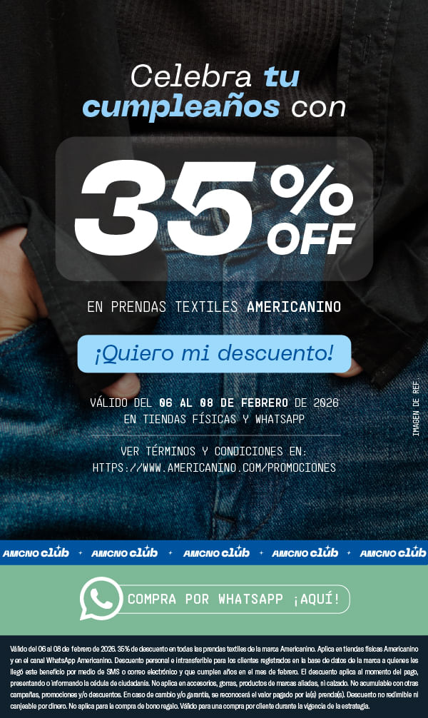 Válido del 10 al 30 de abril de 2026. Recibe 35% de descuento en prendas textiles Americanino para clientes con tres (3) o más compras realizadas entre enero y marzo de 2026. Aplica en tiendas físicas Americanino, tienda online https://www.americanino.com y en el canal WhatsApp Americanino. El descuento aplica en tiendas físicas o Whatsapp al momento del pago, presentando o informando la cédula de ciudadanía y en sitio web al momento del pago ingresando el código. No aplica en accesorios, gorras, calzado, productos de marcas aliadas ni en la compra de bono regalo. No acumulable con otras promociones y/o descuentos vigentes. El descuento se aplica al momento del pago ingresando el código de la promoción. El descuento sólo puede ser redimido una vez por persona. En caso de cambio y/o garantía, se reconocerá el valor efectivamente pagado. Beneficio personal e intransferible. No redimible por dinero.