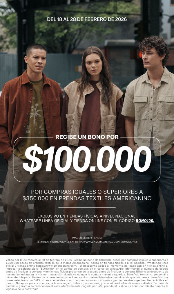 Válido del 03 de febrero al 31 de agosto de 2026. Por la compra de una prenda de cualquier referencia diferente a las referencias de la categoría "JEAN", recibe un bono de $100.000 pesos para redimir en jeans de la marca Americanino para una futura compra. Aplica exclusivamente en la tienda online americanino.com. La redención del bono aplica entre el 03 de febrero al 31 de agosto de 2026 en la tienda online americanino.com, ingresando la palabra clave enviada al correo en el carrito de compras antes de finalizar el pago. Beneficio personal e intransferible, otorgado exclusivamente a los clientes que reciban la comunicación del beneficio por correo electrónico o SMS. Válido un (1) bono por cliente durante toda la vigencia de la estrategia. El bono solo podrá ser redimido en jeans de la marca Americanino. No es acumulable con otras promociones, campañas y/o descuentos vigentes. No es redimible ni canjeable por dinero en efectivo. No aplica para la compra de bonos regalo, calzado, accesorios, gorras ni productos de marcas aliadas. En caso de cambio o garantía, se reconocerá únicamente el valor efectivamente pagado por la(s) prenda(s), conforme a la política de cambios y garantías vigente.